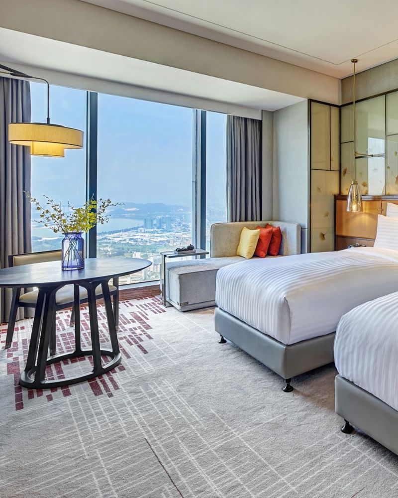 高级客房配备两张单人床,可欣赏江景,在42平方米(452平方英尺)的空间里,为你实现休憩与创意的无缝融合。这处休憩天地位于酒店高楼层,坐拥迷人江景,配备现代化的设施和智能科技,助力激发灵活思绪。
