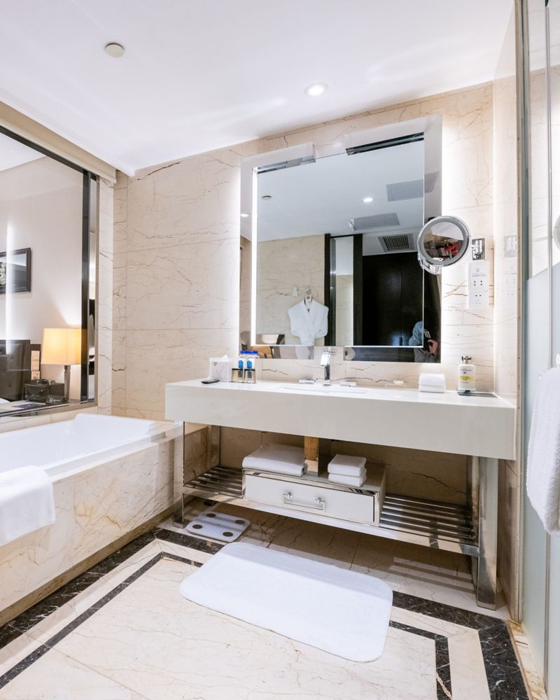 位于 26-30 层,面积 45 平方米,配备 2 张舒适的单人床、独立淋浴、浴缸、47 英寸液晶电视、免费无线网络和全景窗,尊享休闲区礼遇。