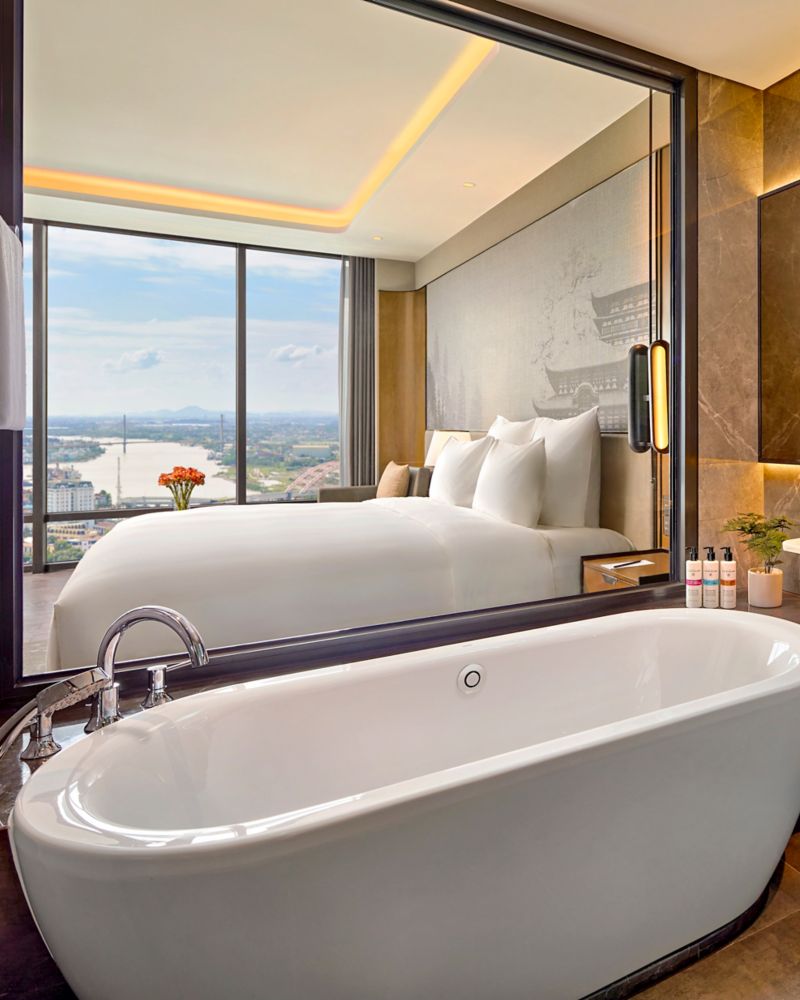 面积 44.6 平方米,可欣赏海防城市景观,配备落地窗和私人阳台。铂尔曼特色床、独立浴缸和步入式淋浴间、日式马桶、浓缩咖啡机、55 英寸网络电视、办公区、免费高速无线网络。