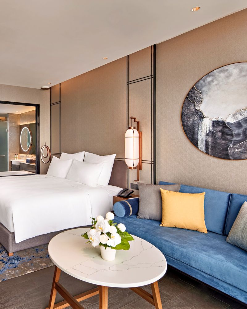 面积 44.6 平方米,可欣赏海防城市景观,配备落地窗和私人阳台。铂尔曼特色床、独立浴缸和步入式淋浴间、日式马桶、浓缩咖啡机、55 英寸网络电视、办公区、免费高速无线网络。