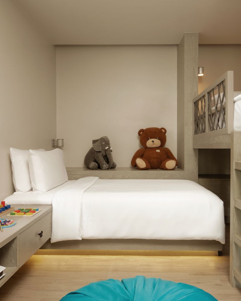 家庭客房面积 68 平方米(732 平方英尺),将焕发活力的森林景观与激发松弛感和创造力的空间融为一体。客房配备高速网络、一台 Nespresso 咖啡机以及精心设计的成人与儿童分区,为家庭生活营造了恰到好处的平衡感。客房邻近儿童俱乐部,更有贴心设施,确保您畅享顺心无忧的住宿体验。