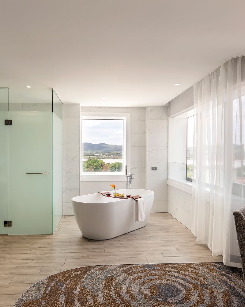 33 SQM. Experience style and comfort in an upscale room with views of Lake Rotorua .The room features a 50" Smart TV, wifi, mini bar, chaise lounge, rain shower, C.O. Bigelow bath amenities and pillow menu.