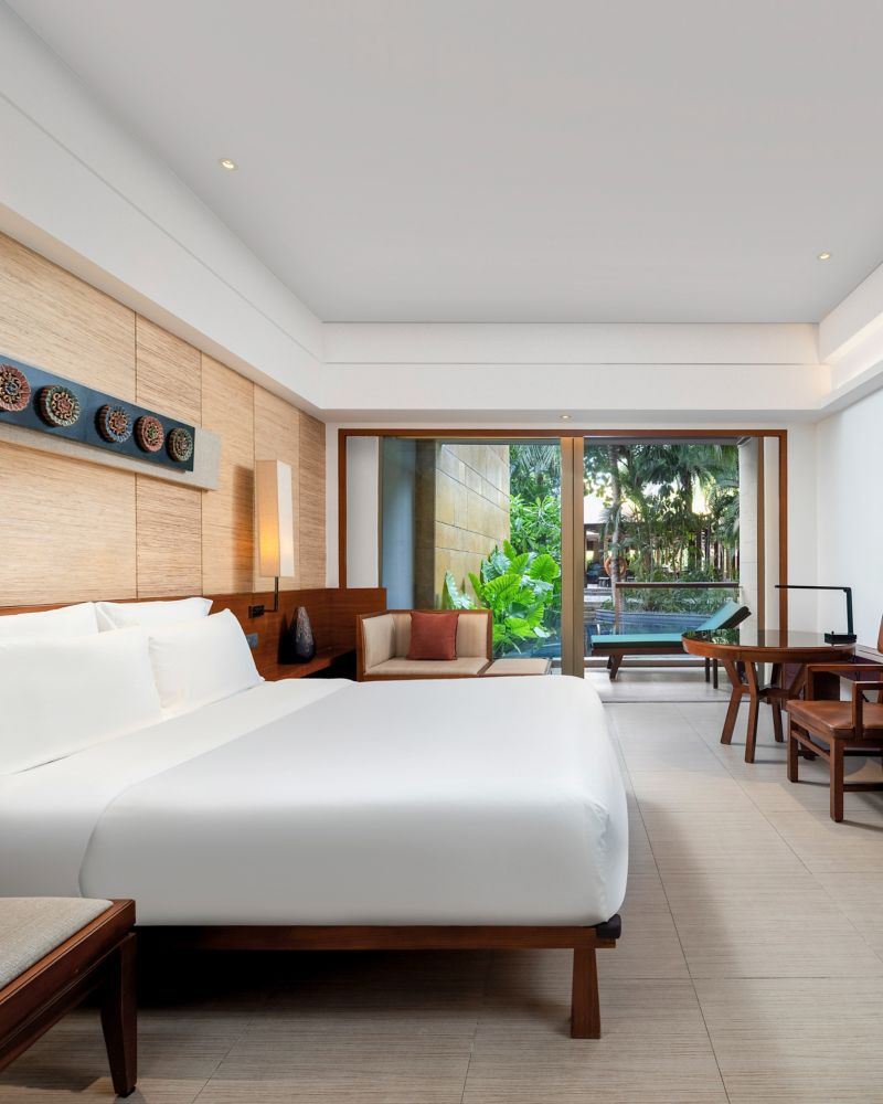 步入豪华直达泳池客房,雅致空间为你打造放松身心、激发灵感的理想天地。房间面积 45 平方米(484 平方英尺),将直达泳池的便利与葱郁的热带花园景观融为一体,是焕活身心、迸发创意的理想之所。客房内配有高速网络、42 英寸液晶电视以及私人阳台,邀你在此放松休憩,重焕活力。
