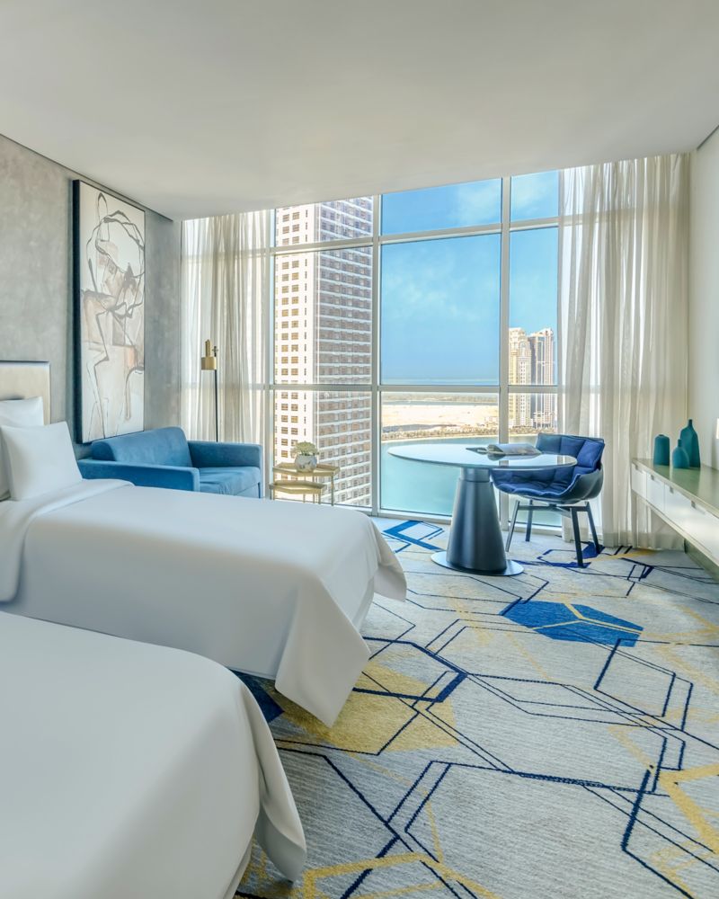 客房面积为 48 平方米,配备 2 张单人床、办公区、迷你酒吧、保险箱、55 英寸超高清 4K 电视、独立控制的空调、浴袍、吹风机和豪华洗浴用品。提供免费矿泉水、茶和咖啡器具以及 24 小时客房服务。