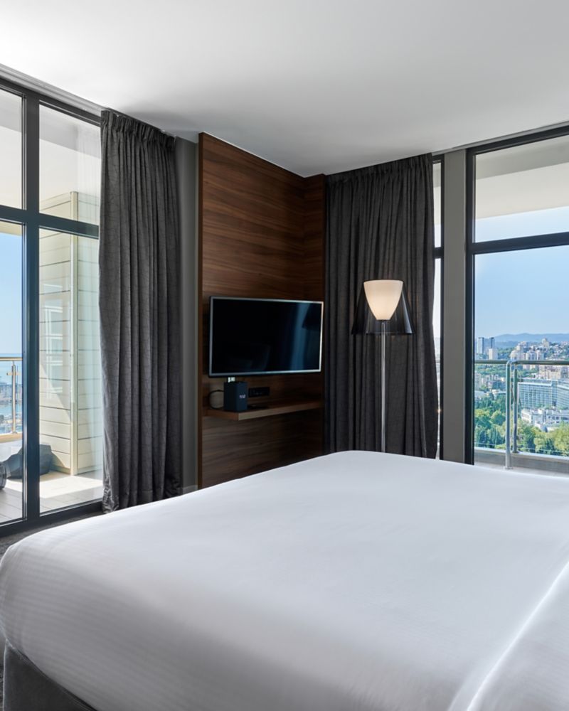 客房面积 33 平方米,带阳台。位于较高楼层,配备 40 英寸电视、媒体面板、无线网络、保险箱、吹风机、品牌化妆品和浴袍,可使用海景休闲区。