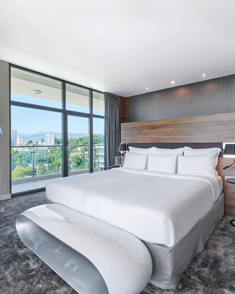 高级房,面积为 33 平方米(355 平方英尺),带阳台,可欣赏城市景观。卧室配备 1 张舒适的特大床和放松枕头。"热带雨"淋浴系统会立刻让您身心愉悦,精力充沛地开启美好的一天。