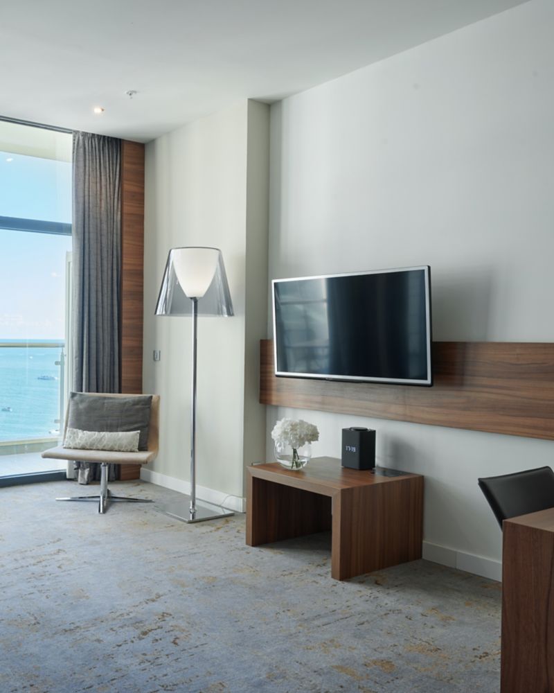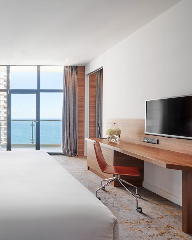 客房面积 33 平方米,带阳台。位于较高楼层,配备 40 英寸电视、媒体面板、无线网络、保险箱、吹风机、品牌化妆品和浴袍,可使用海景休闲区。
