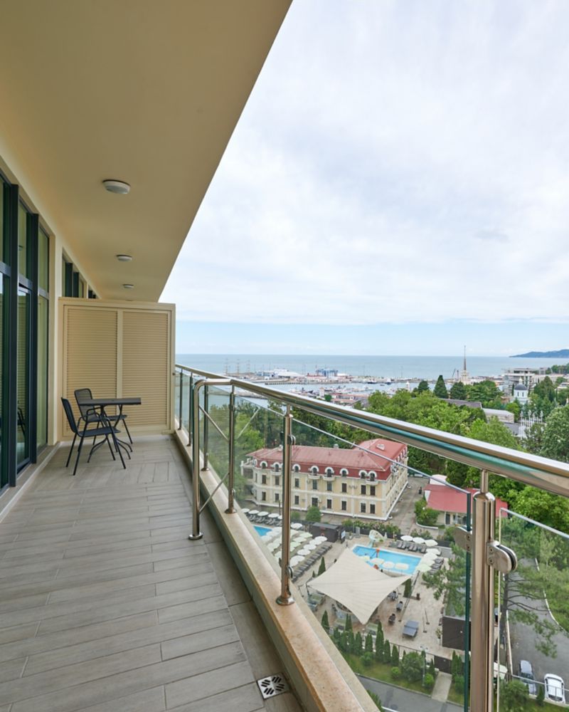 客房面积 33 平方米,带阳台。位于较高楼层,配备 40 英寸电视、媒体面板、无线网络、保险箱、吹风机、品牌化妆品和浴袍,可使用海景休闲区。
