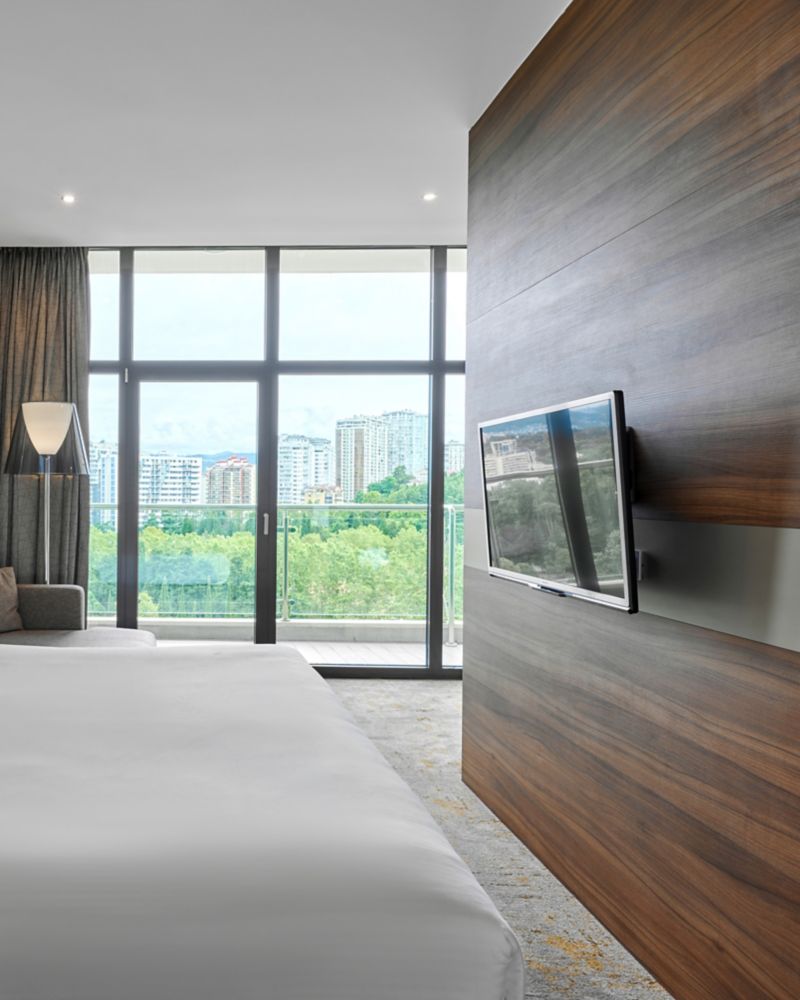 高级房,面积为 33 平方米(355 平方英尺),带阳台,可欣赏城市景观。卧室配备 1 张舒适的特大床和放松枕头。"热带雨"淋浴系统会立刻让您身心愉悦,精力充沛地开启美好的一天。