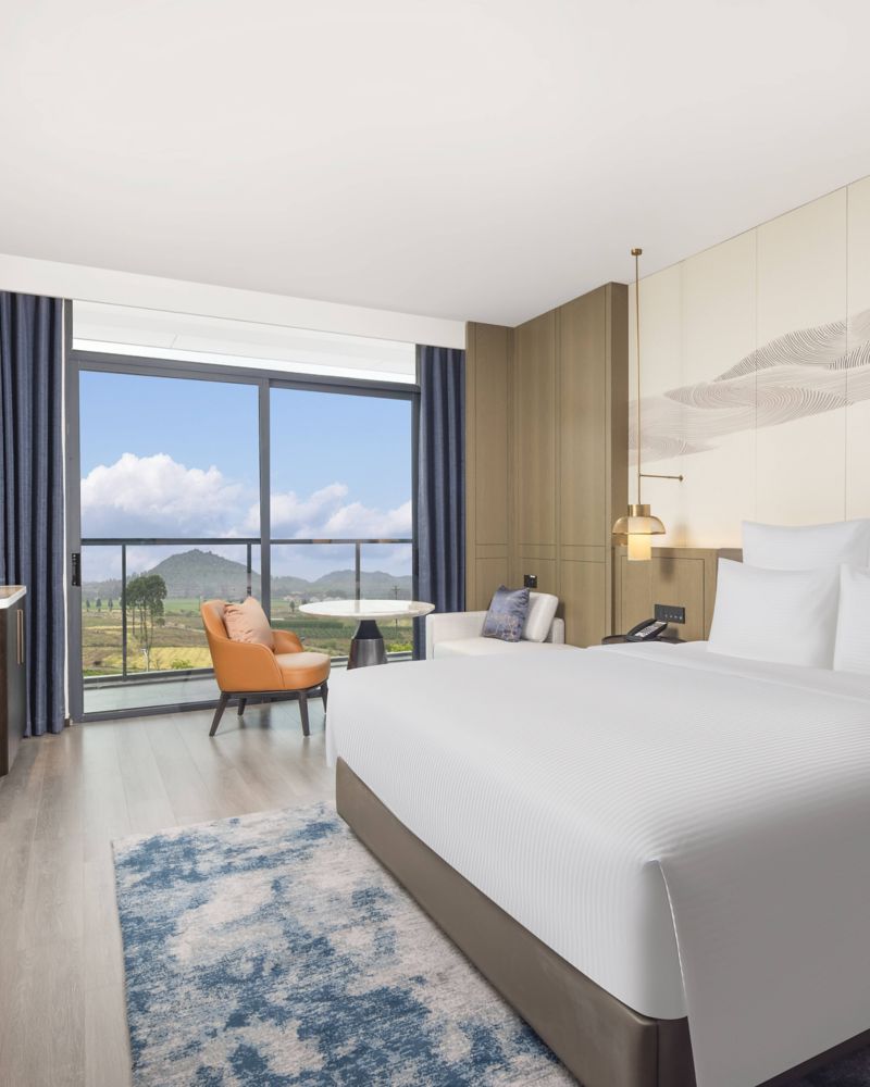 我们的豪华客房配备一张特大床,可欣赏宁静的花园景观或山景,将休憩时光与创意灵感巧妙融合。客房面积为 35 平方米(377 平方英尺),空间设计兼顾休憩放松与高效工作,配备智能科技和贴心设施。